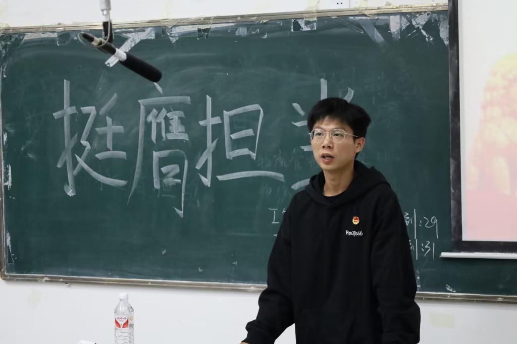 学生党员带领各班级团员青年共同学习习近平新时代中国特色社会主义思想产生的背景、地位、主要内容以及习近平总书记关于青年工作的重要思想和论述,希望全体同学踔厉奋发、勇毅前行,为强国建设、民族复兴伟业挺膺担当。