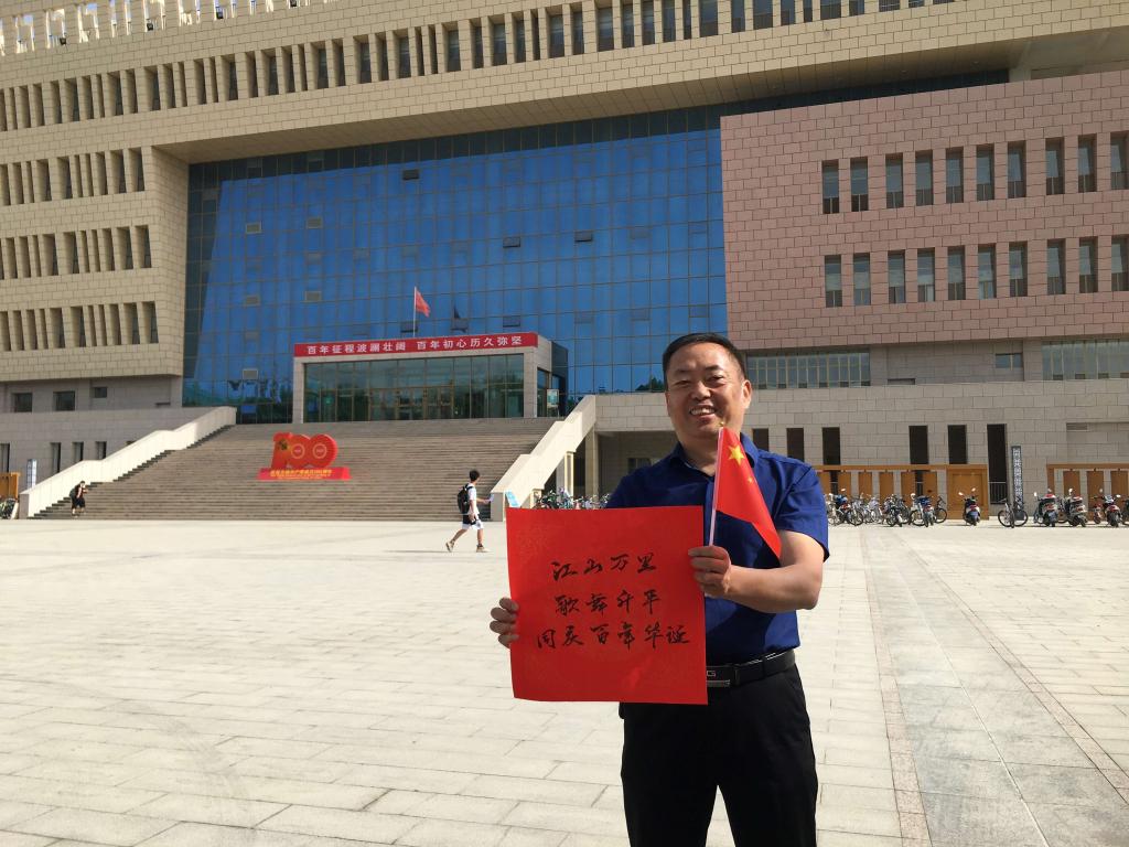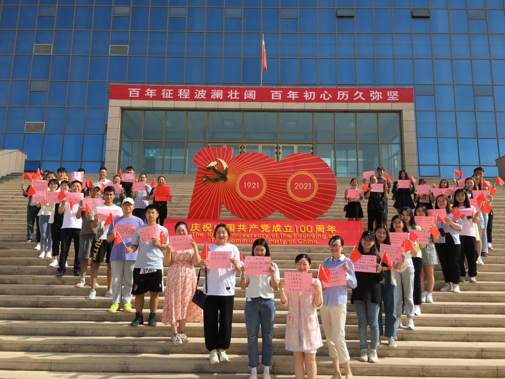 在学校新图书馆门口,党员和接亲同学手拿国旗和对中国共产党成立百年的祝福语,说出自己的祝福并合影留念。