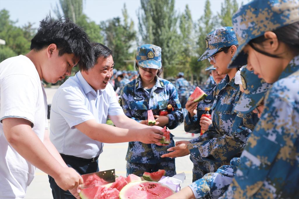 随后,学院领导与教官和学生进行了亲切的交谈,并未他们发放了西瓜、饮料等解暑慰问品。夏日的阳光或许灼人,酷暑的温度也许难耐,但领导们亲切的言语、关怀的举动为炎热的夏日带来了一丝清凉。