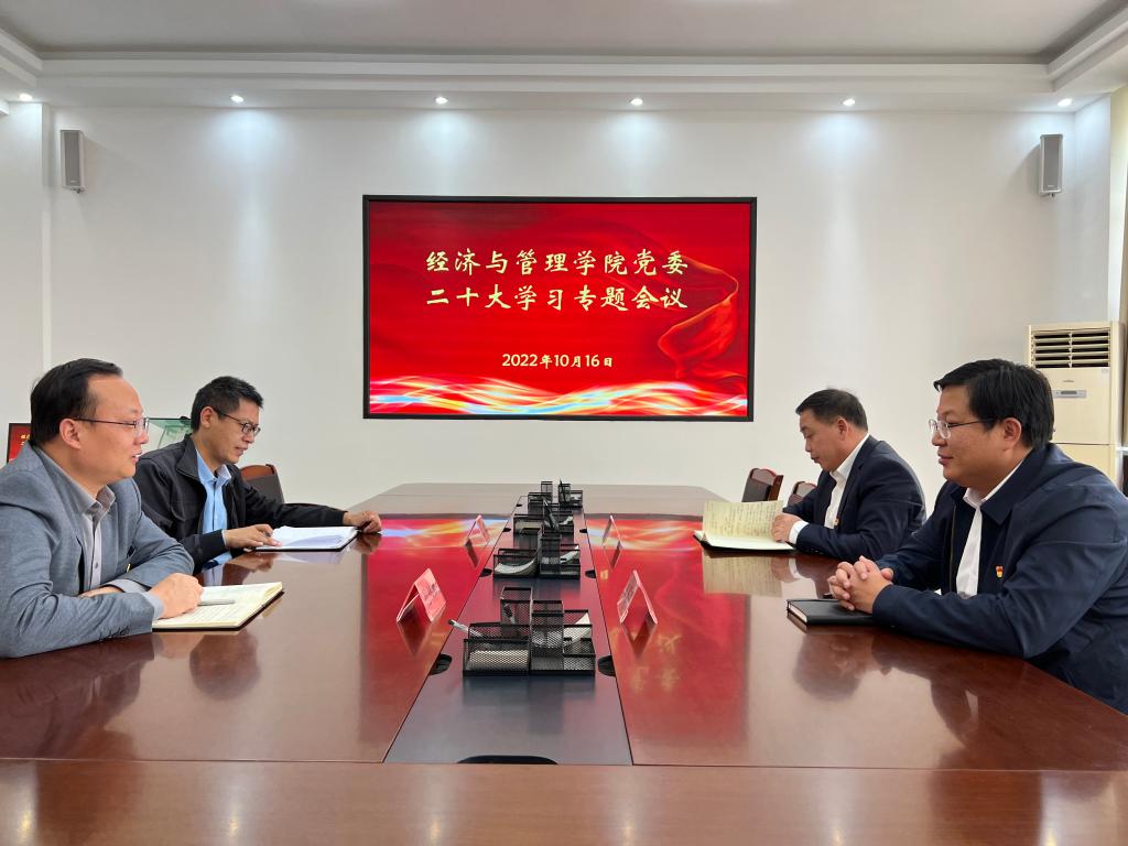 10月16日下午,经管院召开理论中心组集体学习会议,专题学习习近平总书记在中国共产党第二十次全国代表大会上的重要报告精神。学院领导班子成员参会。会议由学院党委书记蒋志辉主持,在文科实验楼209会议室召开。
