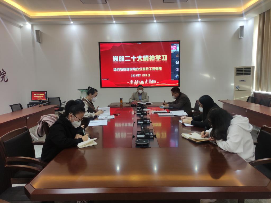 为进一步学习贯彻党的二十大精神,11月2日,办公室教工党支部在文科楼209开展党的二十大精神学习第4次专题学习。会议由支部书记谢枰飞主持,通过线上线下同步方式进行。