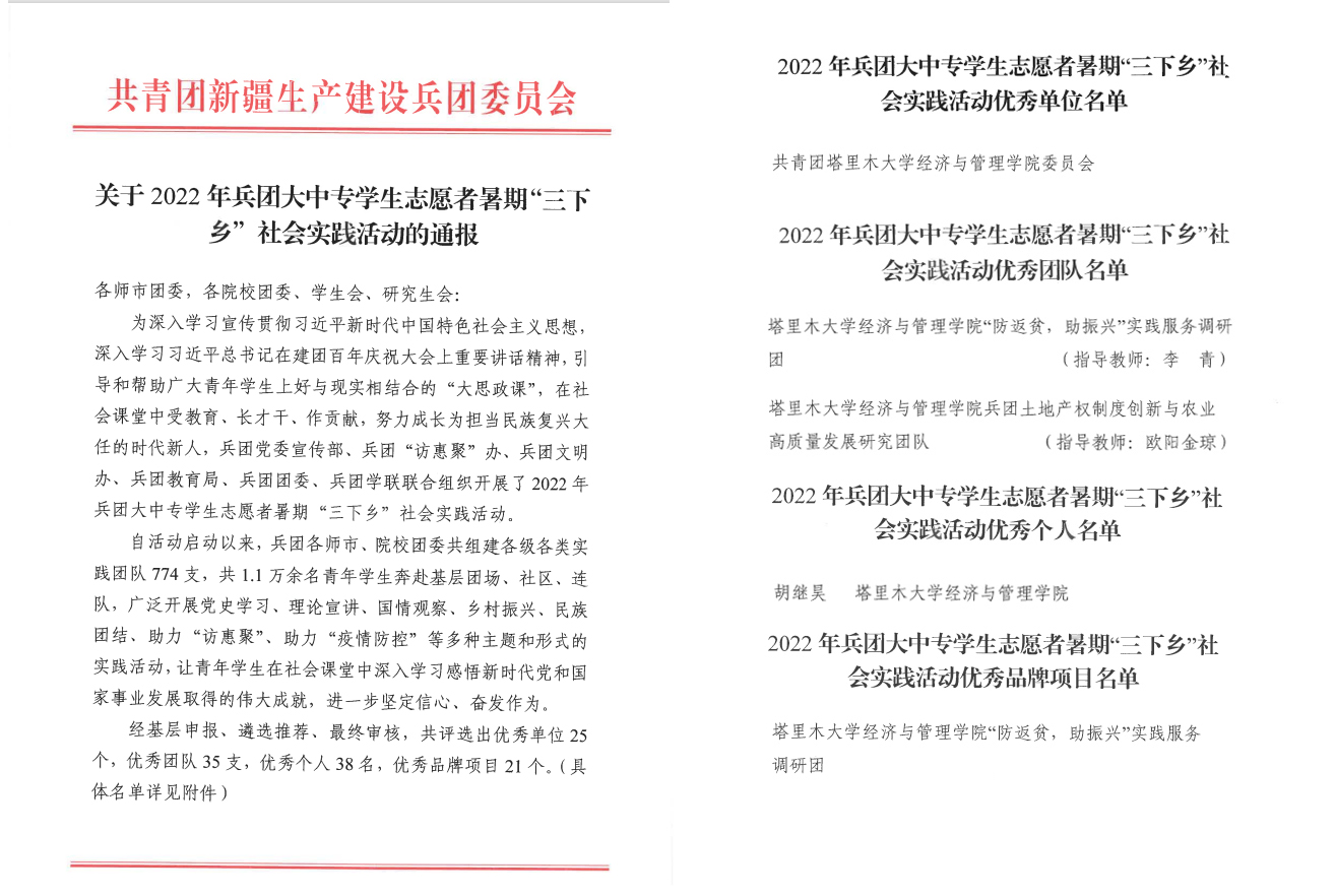 在做好疫情防控的同时积极组织开展大学生暑期“三下乡”社会实践活动。经管师生团队充分发挥专业优势和人才优势,围绕教育帮扶、土地国情调查、理论宣讲、志愿服务、社会观察、生态保护、乡村振兴等内容,积极投身于基层社会建设之中,走乡村、进企业、下社区、入学校,通过多渠道、多形式,深入到南疆各地基层开展暑期“三下乡”社会实践活动。关注国情民情社情、用脚步丈量祖国大地、用眼睛发现中国精神、用耳朵倾听乡村声音、用内心感受时代脉搏。充分展现了经管学子勇担民族复兴大任的靓丽形象和使命担当。