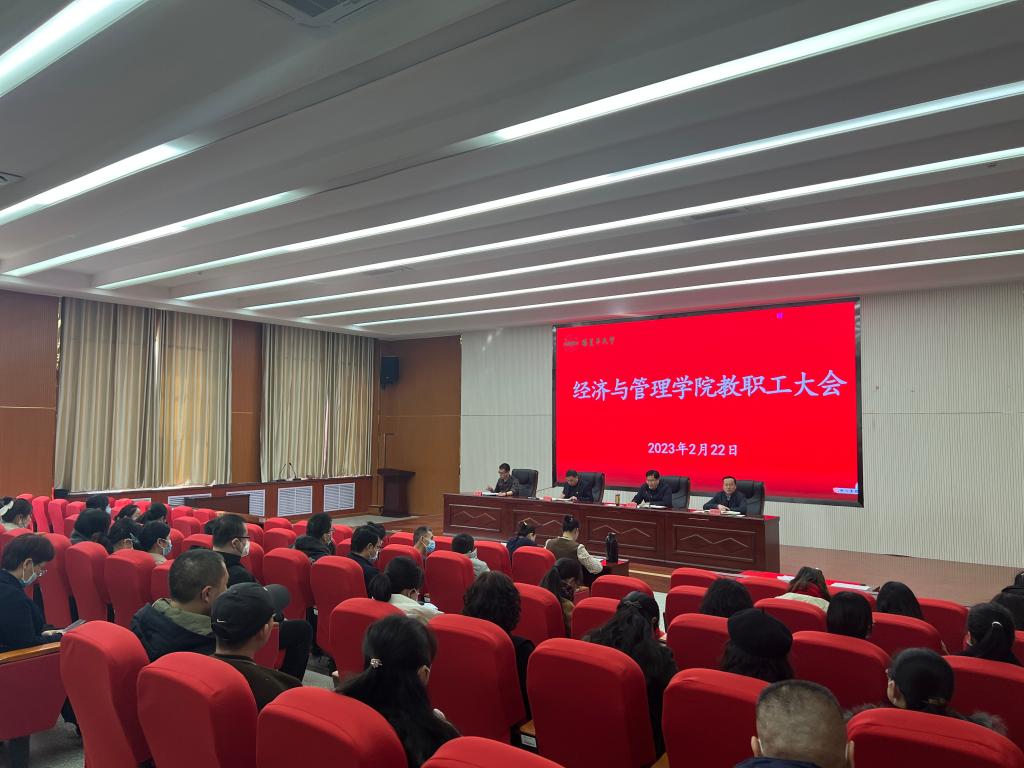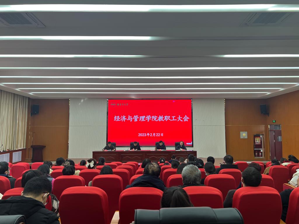 2月22日上午,学院在文科实验楼504报告厅召开2022-2023学年第二学期全院教职工大会。学院党委书记蒋志辉,党委副书记、院长王学剑,党委副书记、纪委书记朱哲,党委委员、副院长晁伟鹏出席会议,参加会议的还有学院全体教职工。会议由王学剑主持。