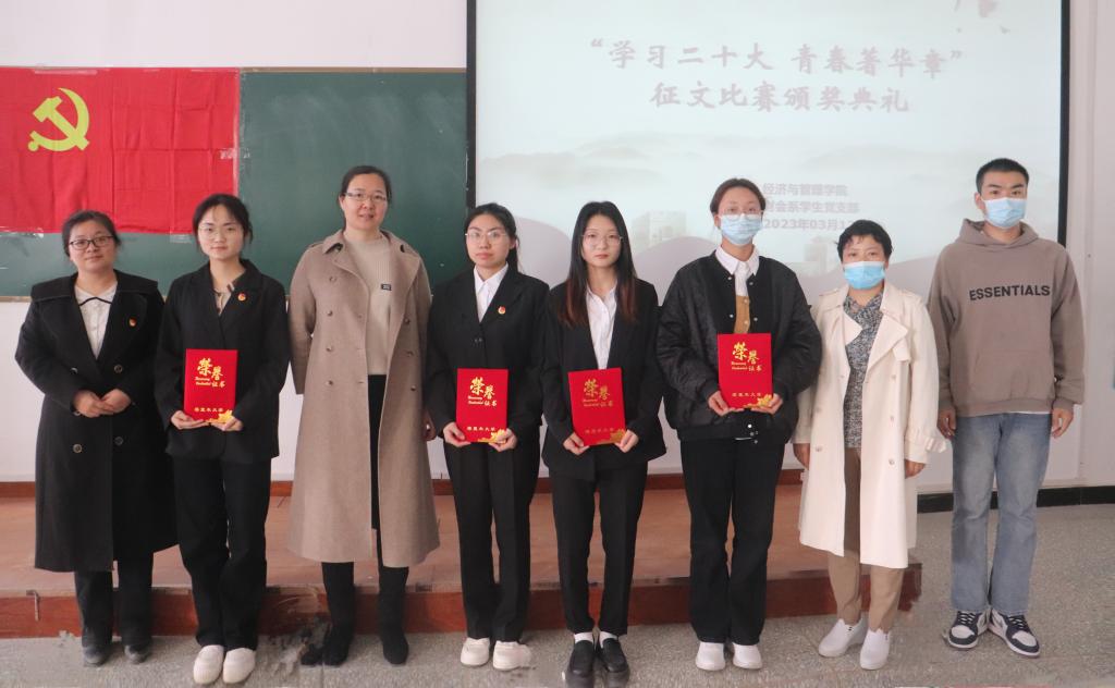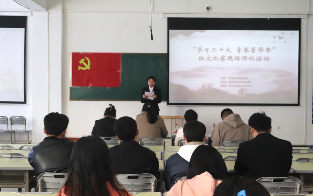 全体学生开展了“学习二十大,青春著华章”征文比赛现场评比暨颁奖活动,参与同学近100人。通过激烈的角逐,评选出了一等奖1名,二等奖2名,三等奖4名。由财会系总党支书记翟少红、财会系主任黄德霞、财会系学生党支部书记徐爱勤、经贸系学生党支部书记徐振威分别为获奖同学颁奖。