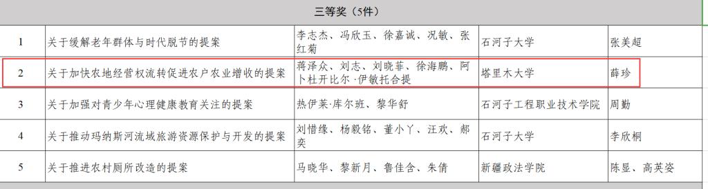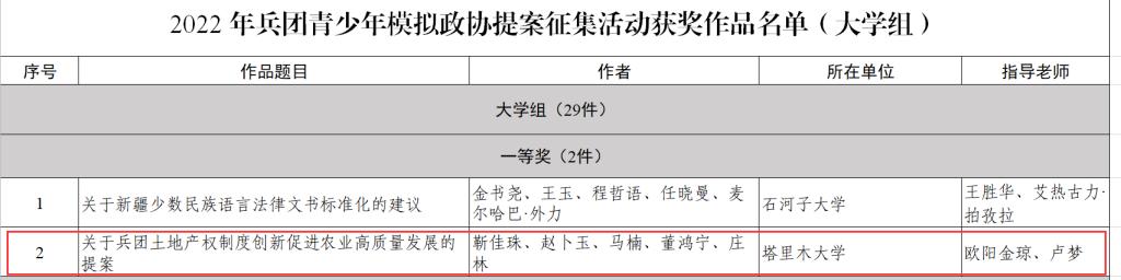 团委所提交的作品《关于兵团土地产权制度创新促进农业高质量发展的提案》荣获一等奖,《关于加快农地经营权流转促进农户农业增收的提案》荣获三等奖。
