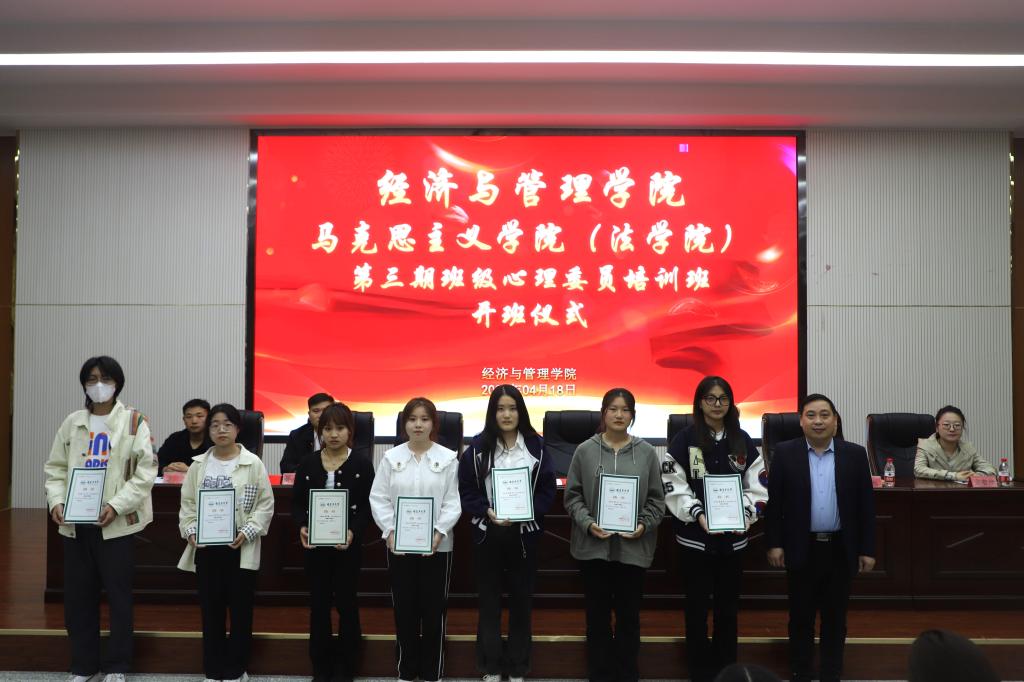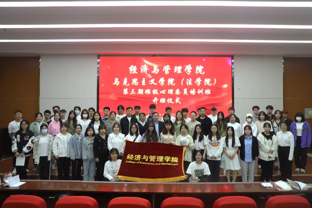 在新文科楼504报告厅举行第三期班级心理委员培训班开班仪式。党委书记蒋志辉,学办主任王小云,团委副书记热纳汗·阿布力米提,辅导员张居一、宋哲坤、崔杰,马克思主义学院(法学院)学办、团委负责人高旭出席开班仪式,经管院全体初级心理委员和拟授中级心理委员,学生会心理健康部全体成员参加仪式。开班仪式由王小云主持。