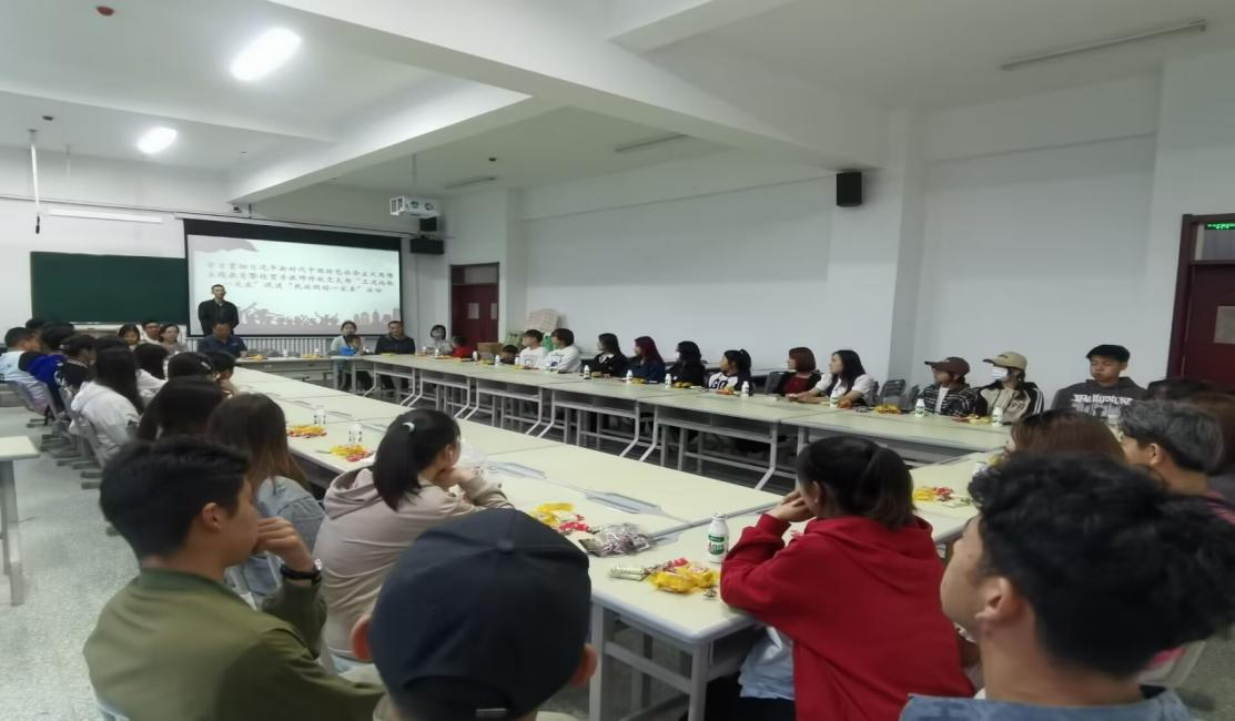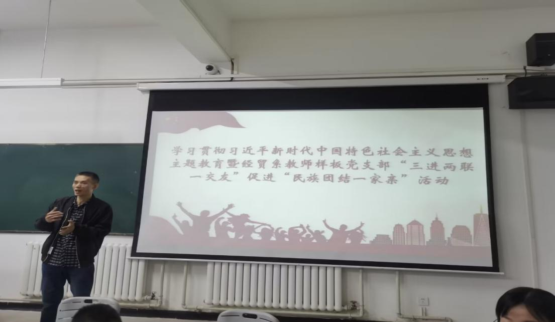 文科实验楼101教室开展了学习贯彻习近平新时代中国特色社会主义思想主题教育暨经贸系教师党支部“三进两联一交友”活动。参加活动的有经贸系全体教师及交友学生。