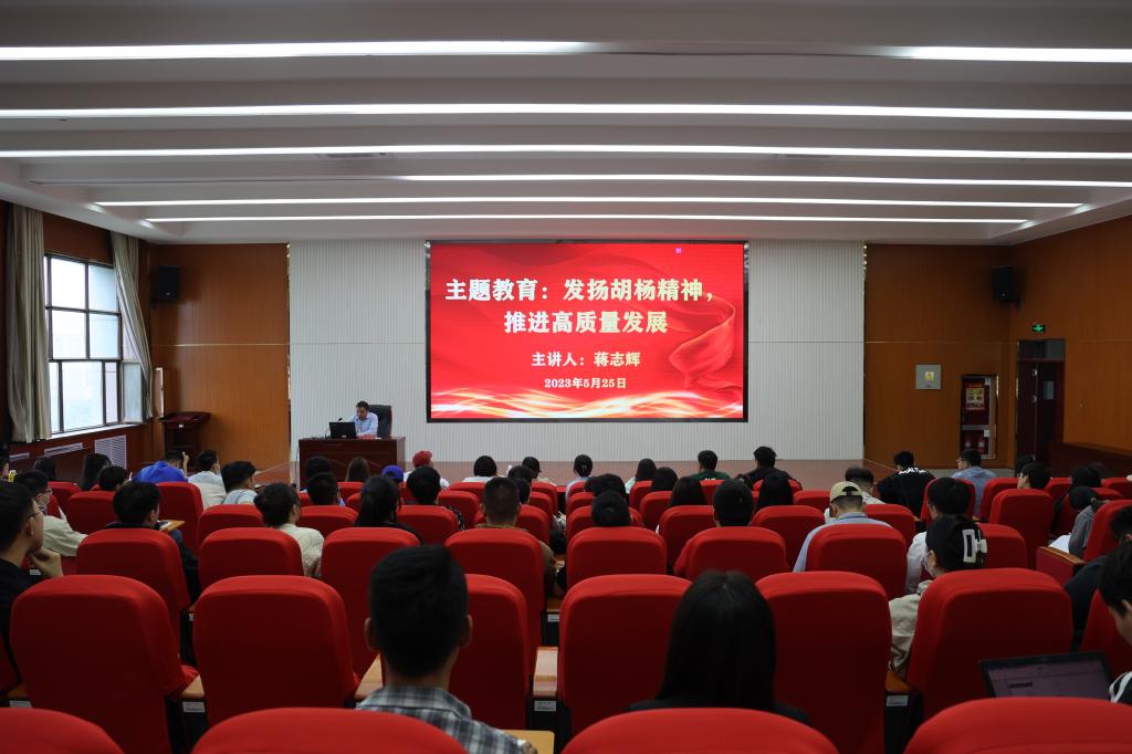 5月25日上午,学院党委书记蒋志辉学院为全体在校研究生讲授“发扬胡杨精神,推动高质量发展”专题党课,讲座在文科实验楼504报告厅进行。