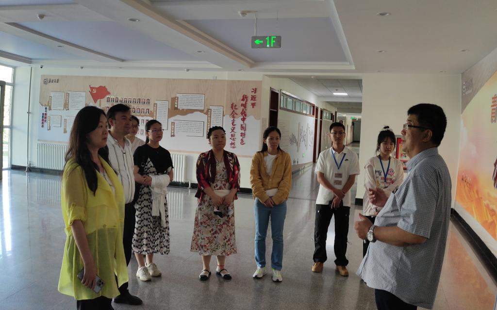 在新疆大学红湖校区12号教学楼,陈文新书记介绍了新疆大学旅游学院党委学生工作部、新疆历史文化可持续发展重点实验室、教师科研及教学工作室以及旅游管理信息系统、导游模拟等实训室概况,马丽霞、李俊等师生一行认真聆听、学习。