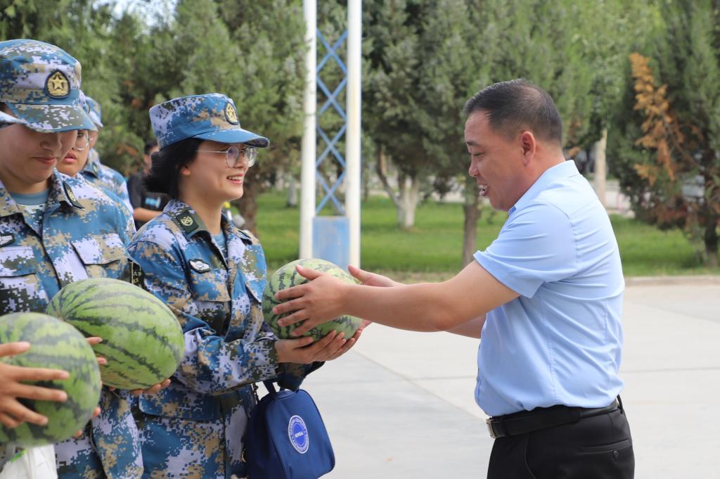 随后,学院领导与教官和学生进行了亲切的交谈,并为他们发放了西瓜、饮料等解暑慰问品。夏日的阳光或许灼人,酷暑的温度也许难耐,但领导们亲切的言语、关怀的举动为炎热的夏日带来了一丝清凉。