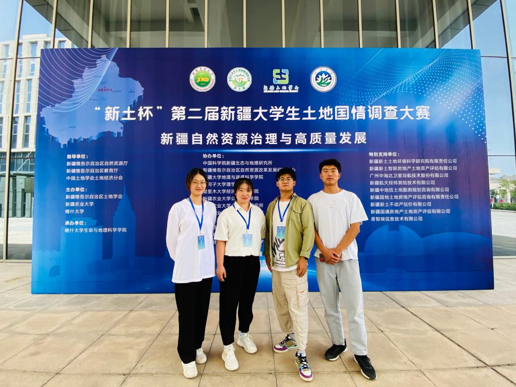 王悦同学组建团队在蒋志辉老师和邢怀浩老师指导下,凭借作品《塔里木河流域农业水土资源时空匹配关系研究》获二等奖;霍瑜老师指导的,付玮同学组建的团队凭借作品《不同土地利用情景下塔里木河流域碳储量变化模拟与预估》获二等奖;靳佳珠同学组建的团队在欧阳金琼老师指导下,凭借作品《新疆农业高质量发展促进农民增收的实现路径研究》获二等奖。