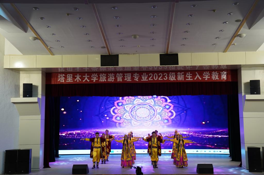 第二篇章——蓬勃。大二如何更充实?2021级同学分享了学科竞赛、社会实践和资格证考试,其中再现了旅游管理专业主办的特色赛事——导游大赛的赛场模拟,使新生初次认识导游大赛的讲解和才艺展示环节,同时,学长们表演的维吾尔族舞蹈也生动诠释了《新疆民俗旅游专题》等特色课程的魅力。