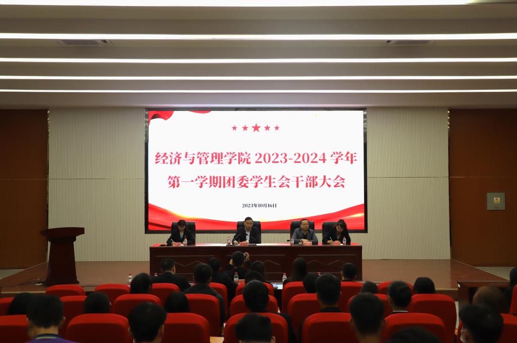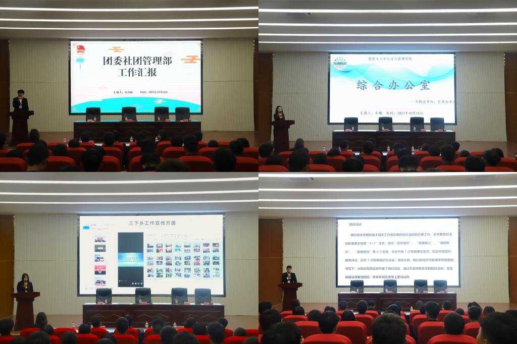 2023-2024学年第一学期团委学生会干部大会在文科实验楼504报告厅顺利召开。学院党委书记蒋志辉,学院党委委员、副院长晁伟鹏出席大会,学办团委全体辅导员,团委学生会全体学生干部,宿管会和社团负责人参与本次会议。
