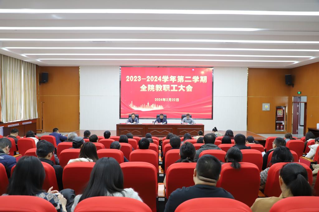 2月22日,学院在文科实验楼504报告厅召开2023-2024学年第二学期全院教职工大会。学院党委书记蒋志辉,党委副书记、纪委书记朱哲,党委委员、副院长晁伟鹏出席会议,参加会议的还有学院全体教职工。会议由蒋志辉主持。