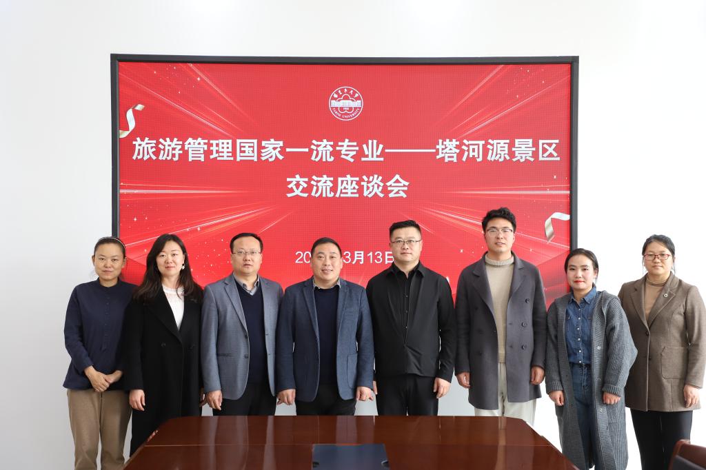 ,回顾了师市与塔大在文旅领域的友好合作,同时表示,塔河源景区是本学期首个进校交流的企业,在南疆旅游业向好发展,塔大国家级一流本科专业旅游管理专业建设的关键期,希望双方在挖掘资源价值、提升旅游产品质量方面深入合作,共同讲好南疆故事,服务南疆经济社会发展。苏宏伟介绍了新疆塔里木文化有限公司(塔河源景区)概况,强调塔河源景区作为生态自然景观独特的旅游目的地,在保护生态环境基础上,正在完善不同功能区,为了在阿拉尔1小时经济圈内更好地吸引游客,期望得到学院支持,在景区人力资源管理、旅游产品设计营销、旅游财务管理、塔河源文化价值挖掘和提升等领域派驻实习生。晁伟鹏介绍了学院毕业生实习方式、实习时间和指导要求,并邀请塔河源景区针对旅游管理专业人才培养方案的实习环节提出具体意见和需求。最后双方与会者就具体合作领域交流沟通并合影留念。