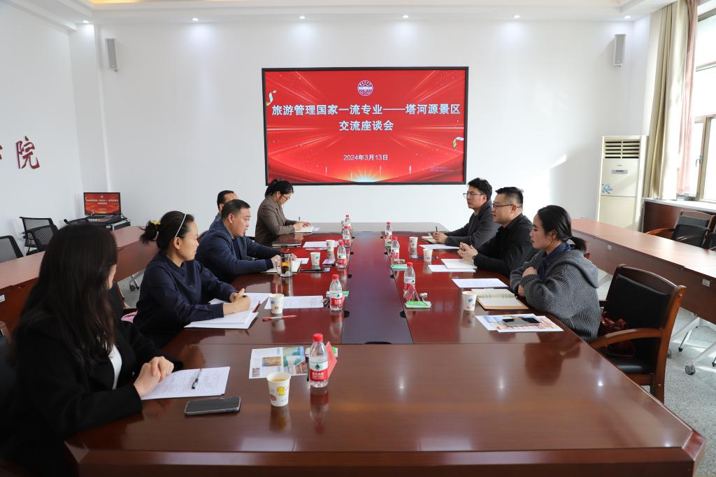 与新疆塔里木文化有限公司(塔河源景区)召开交流座谈会。学院党委书记蒋志辉,党委委员、副院长晁伟鹏,新疆塔里木文化旅游有限公司(塔河源景区)执行董事苏宏伟,行政主管石云龙出席交流活动,双方代表参加了会议。会议由旅游管理系主任李俊主持。