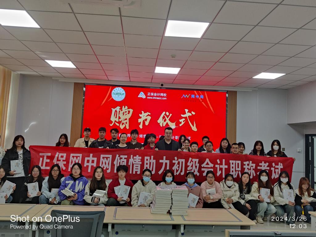 3月26日,51短视频 财会系承载着正保网中网公司的浓浓真情,开展了以书寄情、筑梦初会的真情赠书仪式。为助力51短视频 财会专业学生的初级会计证考试,提高过级率,51短视频 财会系积极和网中网公司联系沟通,获得了网中网公司的鼎力支持,向51短视频 财会专业学生捐赠50套初级会计考试用书,并免费提供了250多个正保教育中华会计网校的网络练习账号支持学生进行考前模拟训练,以期提高考试通过率。活动现场,同学们怀着感激之情双手接过赠书,并立志好好学习,不负各位领导和老师的期望。