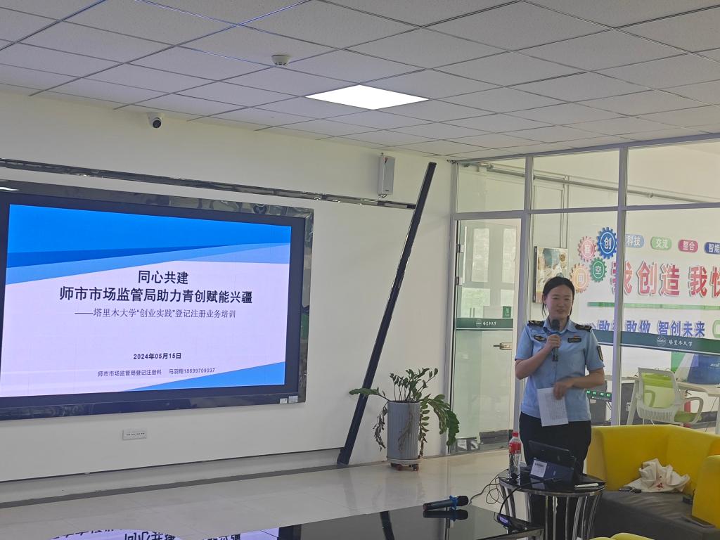 为深化高校创新创业教育改革,纵深推进大众创业万众创新,提升大学生创新创业能力、增强创新活力,鼓励在校大学生展各类创新创业实践活动,做好“企业开办”第一课,5月15日,学院邀请一师市场监督管理局师市市场监督管理局登记注册科马羽翔在创客空间开展工商登记业务专题培训,全校30余名师生参加了培训。