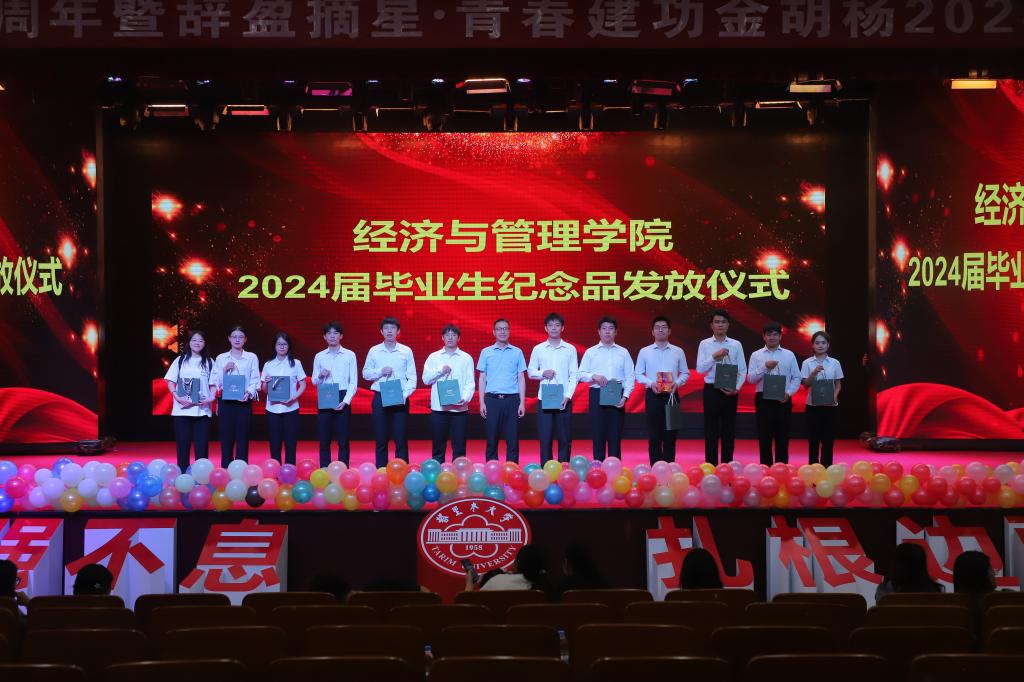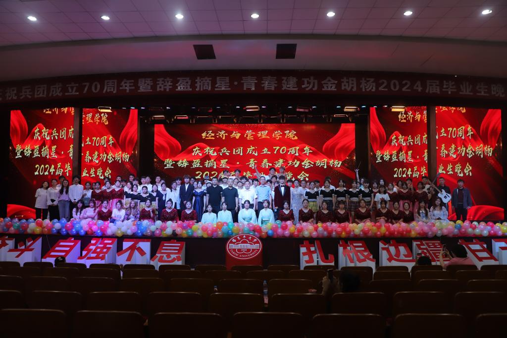 6月5日晚,经济与管理学院“兵团成立70周年暨摘星·青春建功金胡杨”2024届主题毕业生晚会于行政楼B座报告厅举办。学院党委书记蒋志辉,党委副书记朱哲,各系领导及师生代表参加。