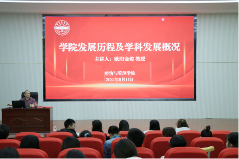 2024级研究生进一步了解学院的发展历程及学科发展状况,2024年9月11日上午,农林经济管理学科学科带头人欧阳金琼教授在文科实验楼504报告厅开展新生入学教育专题讲座。