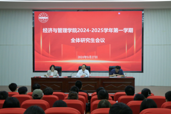 召开2024-2025学年第一学期全体研究生会议,党委委员、副院长晁伟鹏,经贸系主任、学位点负责人苏旭峰出席会议,2022级、2023级、2024级全体全日制研究生参会,会议由科研与研究生管理办公室主任王春霞主持。