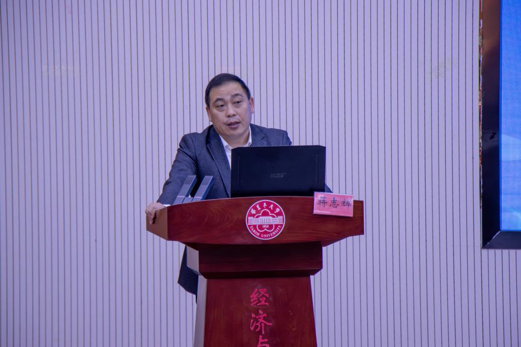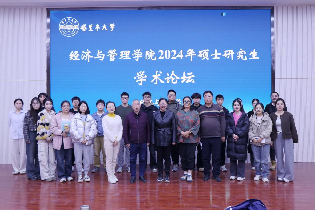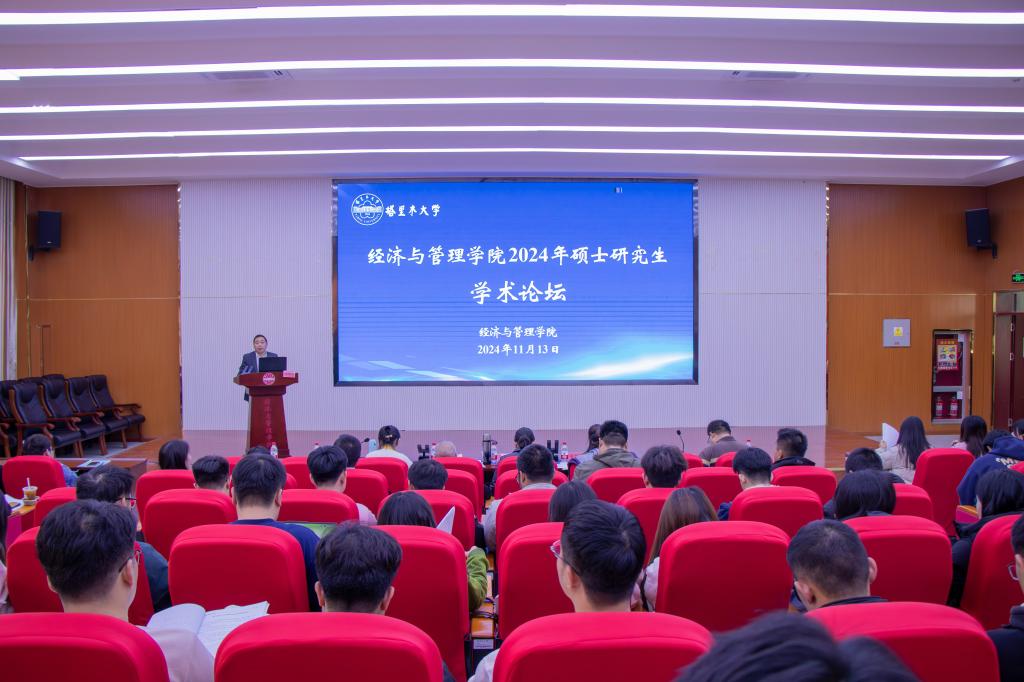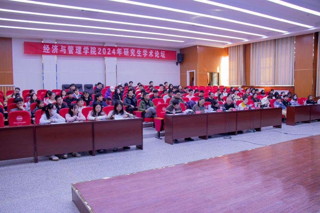 在文科实验楼504报告厅举办2024年硕士研究生学术论坛,出席本次论坛的有学院党委书记蒋志辉,银龄教师李筱光、何平平,学术带头人石晶、经济贸易系主任苏旭峰,学院教师朱叶以及学院全体研究生。