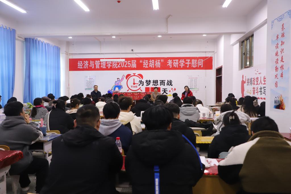 于新文科楼112举办2025届“经胡杨”考研学生慰问会。学院党委书记蒋志辉,学院党委委员、副院长晁伟鹏、顾继岩,学办主任王小云,辅导员郁轩出席会议。