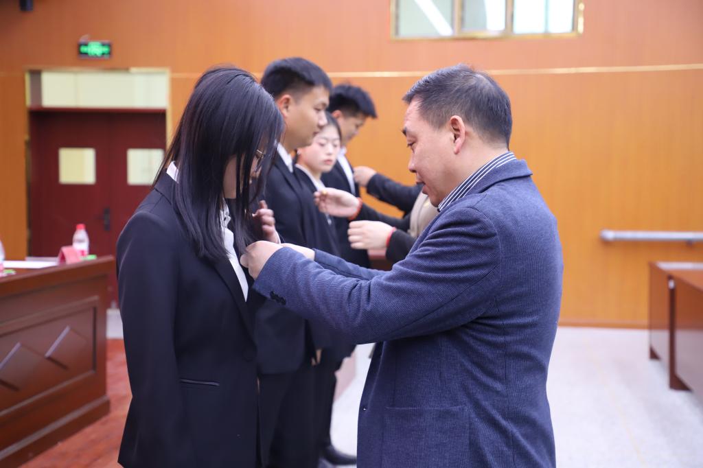 会议伊始,全体起立,奏唱国歌,接着,由党政办主任李黎同志宣读学院党委对新党员同志的批复,并由学院领导及各学生党支部书记为新党员佩戴党员徽章,之后由党委书记蒋志辉带领新党员进行入党宣誓,老党员重温入党誓词。