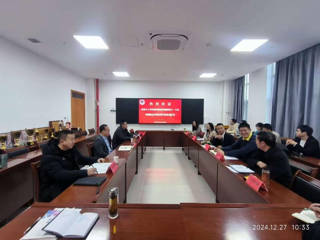 副院长晁伟鹏、工商系主任马信春、学办辅导员郑志伟一行三人于2024年12月27日受邀前往新疆政法学院经济管理学院交流学习。新疆政法学院经济管理学院负责人孙海军教授主持会议,各系办负责人及部分教师参加。