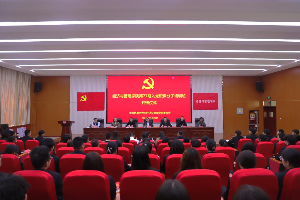 为深入学习贯彻习近平新时代中国特色社会主义思想和党的二十届三中全会精神,加强入党积极分子的培养教育,提高入党积极分子的思想觉悟,3月22日下午,学院在文科实验楼504报告厅举行第77期入党积极分子培训班开班仪式。学院党委书记蒋志辉、党委副书记、纪委书记朱哲、学院各党支部书记,学生党员代表及第77期入党积极分子136名学员参加。开班仪式由经济贸易系学生党支部书记王宏图主持。