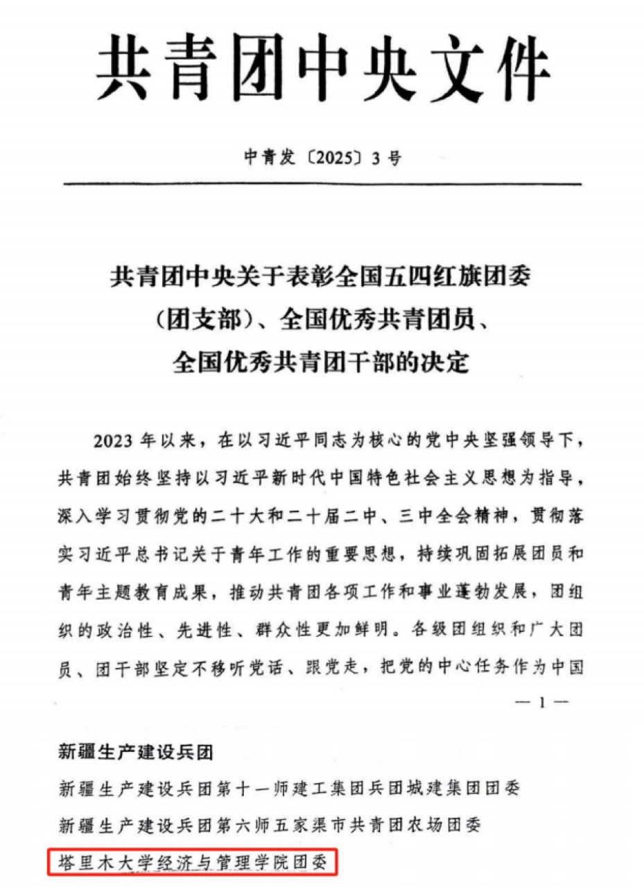 此次荣誉的获得,既是对学院共青团工作的高度肯定,也标志着学院在落实立德树人根本任务、服务南疆经济社会发展方面迈出了坚实的步伐。未来,学院将以“全国五四红旗团委”为标杆,进一步提升人才培养质量,以胡杨精神培育时代新人,为学校建设兵团特点南疆特色一流大学贡献经管力量,让青春在建设新时代中国特色社会主义新疆实践和兵团实践中绽放绚丽之花。
