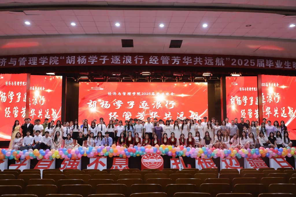 5月25日晚,学院“胡杨学子逐浪行,经管芳华共航”2025届毕业生晚会在文科楼B座报告厅拉开帷幕。学院党委副书记、纪委书记朱哲,副院长顾继岩,副院长李博,各系领导,全体辅导员以及2025届毕业生欢聚一堂,共同见证这场充满青春活力与梦想情怀的盛会。