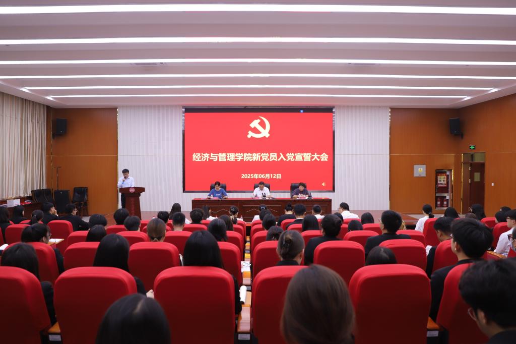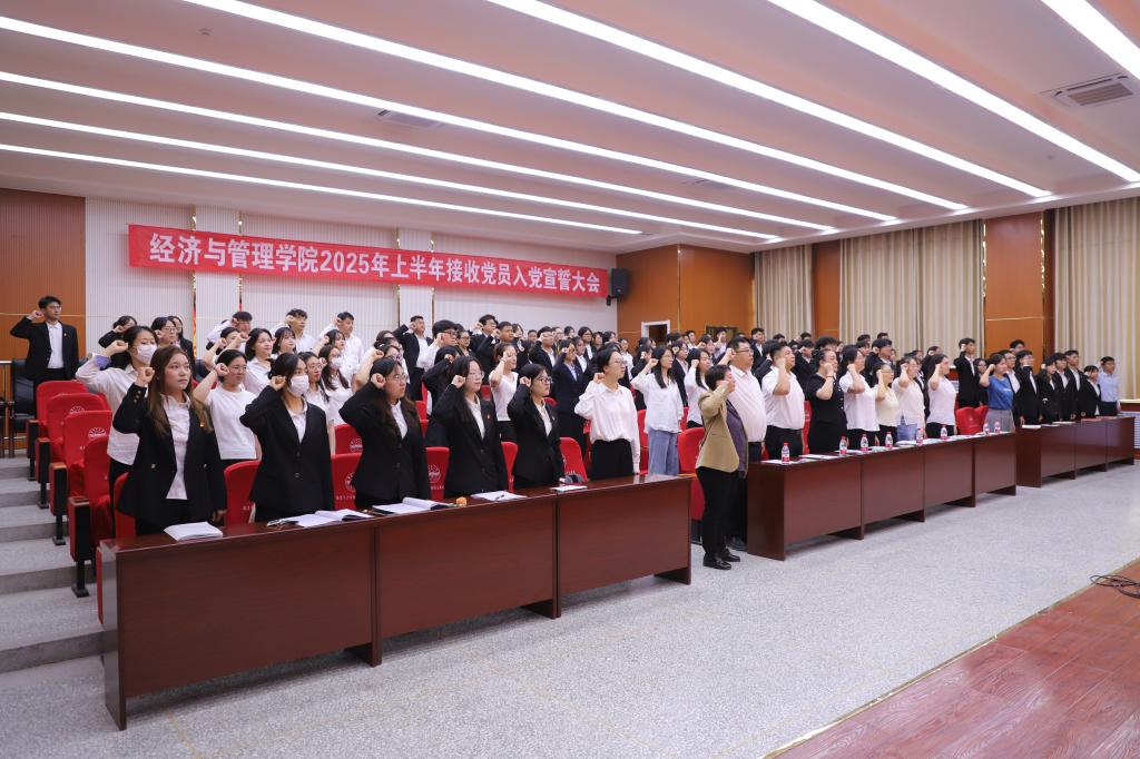 于文科实验楼504会议室召开2025年上半年新党员入党宣誓大会。学院党委书记蒋志辉、副院长顾继岩、党委委员副院长李博、各系党总支书记、党支部书记、2025年上半年新接收预备党员、转正党员及各支部党员代表参会。