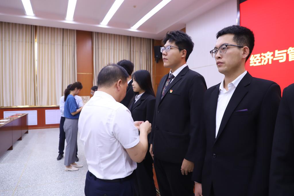 大会在庄严的国歌声中拉开序幕。随后,副院长李博宣读学院党委对新党员同志的批复。学院领导为新党员代表佩戴党徽,一枚枚党徽,承载着责任与使命。在党委书记蒋志辉的领誓下,新党员进行入党宣誓,老党员重温入党誓词,铮铮誓言,彰显坚定信仰。