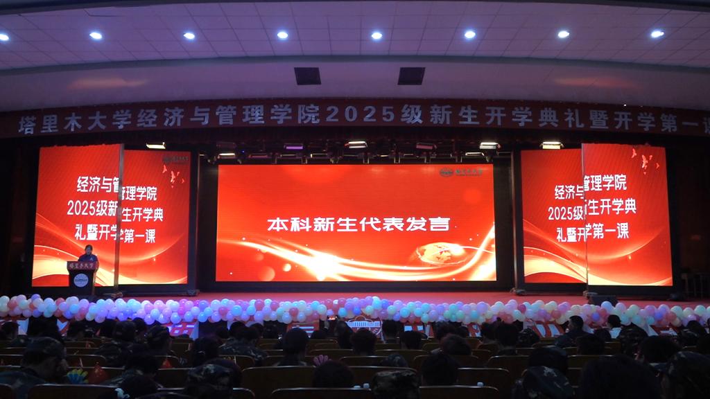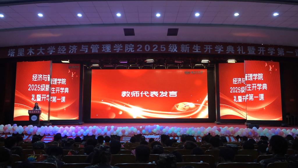 王学剑院长发表致辞。他代表学院全体师生向2025级新同学表示热烈的欢迎。他指出,大学是探索真理、塑造品格的重要阶段,希望同学们珍惜校园时光,既要掌握扎实的专业知识,又要培养创新思维;既要保持严谨学风,又要勇于实践探索。他勉励新生树立远大志向,在经管学院的培养下不断提升综合素养,努力成长为服务南疆经济社会发展的优秀人才。