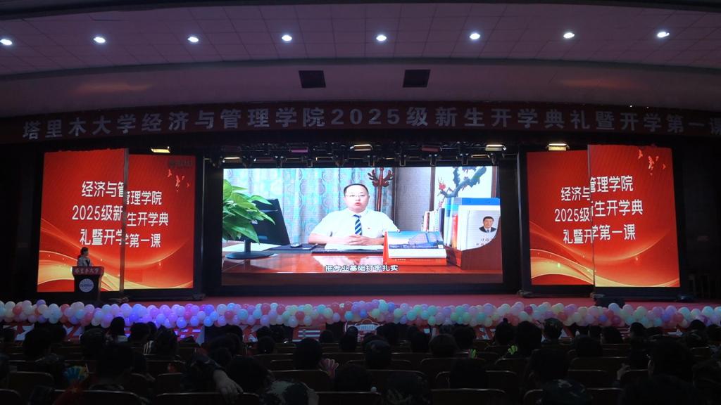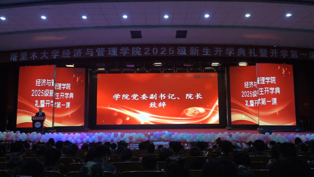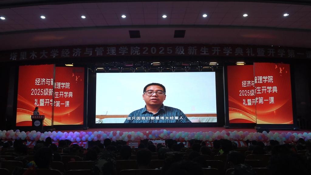 蒋志辉教授以《经管院的今天·明天》为题讲授开学第一课。他介绍了学院的学科优势、师资力量和硬件设施,强调这些资源将为学子成长提供坚实保障。同时,他特别指出学院注重营造温馨包容的育人环境。面向未来,他描绘了以"新商科"为引领的发展蓝图,勉励新生将个人理想融入学院建设。最后,他寄语新生要立大志,扎根边疆、勤学习,练就真本领、敢担当,做担当大任经管人。