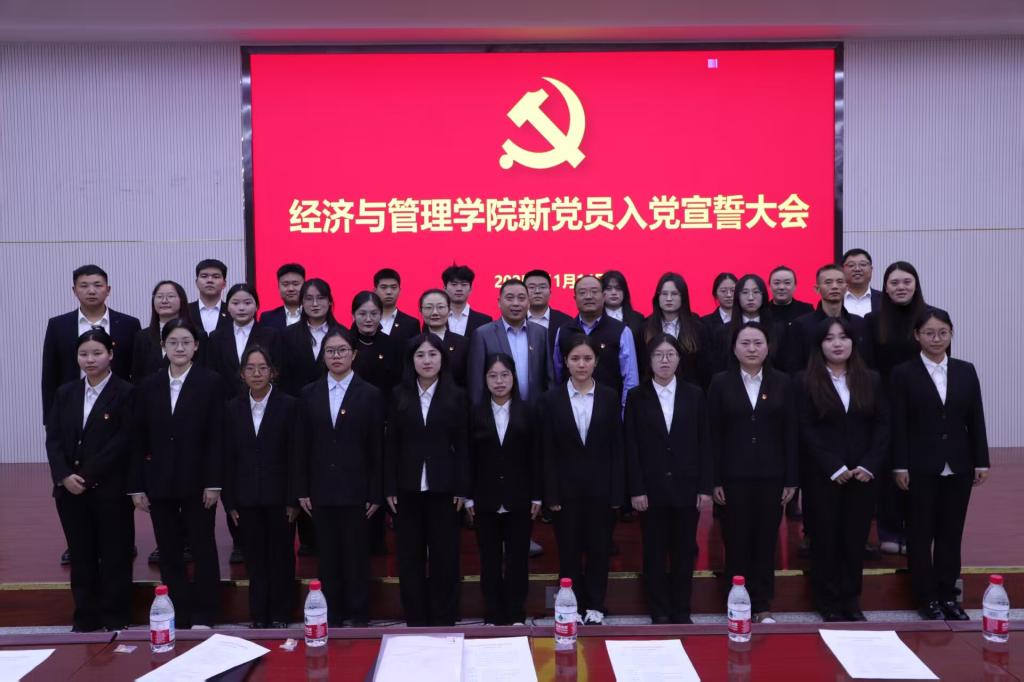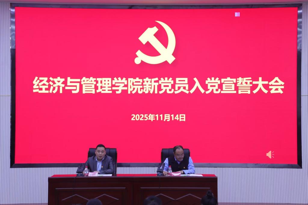 党委于2025年11月14日下午18:30在文科实验楼504报告厅举行2025年下半年新党员入党宣誓大会。学院党委书记蒋志辉、副书记陈曙、各系党总支书记、各党支部书记、2025年上半年新接收预备党员、转正党员及各党支部在校党员参加。会议由经济贸易系学生党支部书记王宏图主持。
