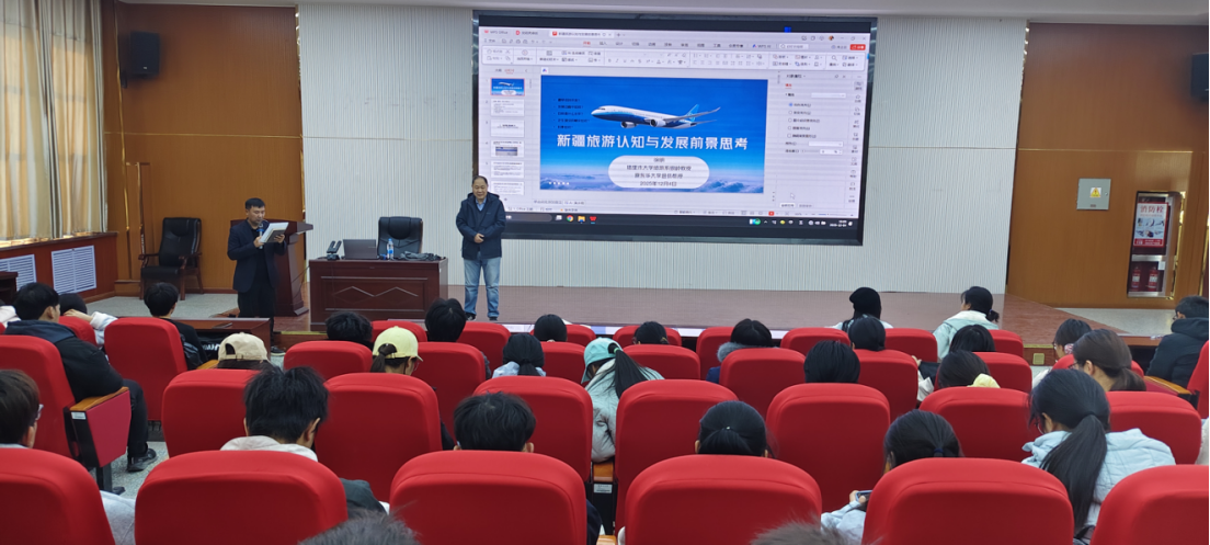 旅游管理系在文科实验楼504教室成功举办旅游研究专题讲座。本次讲座特邀本校银龄教师、东华大学教授、博士生导师徐明担任主讲人,以《新疆旅游认知与发展前景思考》为题展开深度分享,旅游管理专业全体师生现场聆听,系党支部书记居尔艾提・吾布力主持活动。
