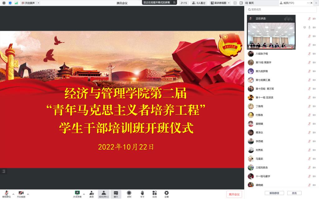 为深入贯彻习近平总书记在党的二十大报告中对广大青年的期望。10月22日,经管院第二届青年马克思主义者培养工程开班通过采用腾讯会议在文科实验楼实训室503举行。学院院党委书记蒋志辉,学校团委副书记毕永福出席开班仪式,学院党委副书记、纪委书记朱哲主持会议。学院工商系党总支书记胡宝华,经贸系党总支书记孙良斌,财会系党总支书记翟少红,学院学工战线全体辅导员,青马工程培训班全体学员参加开班仪式。