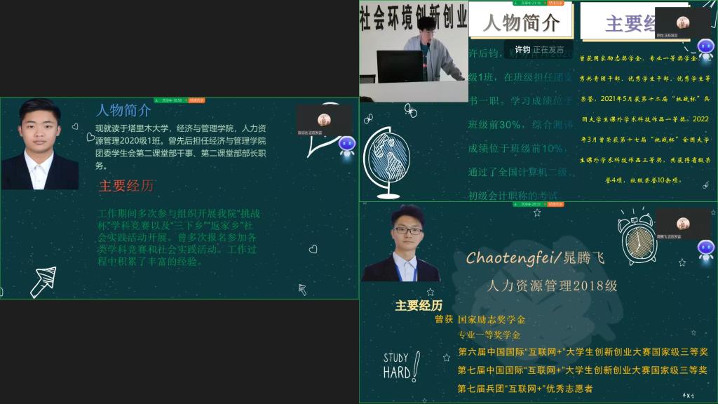 为贯彻落实总书记在党的二十大报告中“全面提高人才自主培养质量,着力造就顶尖创新人才”的指示精神,培养学生创新精神和实践能力,有效搭建学生科创服务平台,10月23日,学院团委邀请往届优秀项目负责人开展线上经验交流分享会。会议分上下两场进行,邀请到晁腾飞、段志达、许后钧、蒋泽众、徐海鹏五位经验丰富的同学围绕“挑战杯”竞赛相关内容进行交流分享。