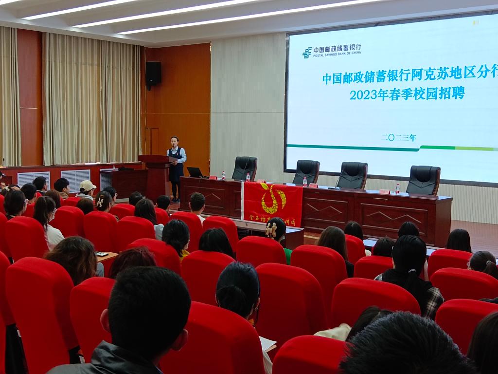 为促进毕业生深入了解就业市场,并实现高质量充分就业,进一步推进校企合作,中国邮政储蓄银行阿克苏地区分行阿拉尔支行于3月28日上午11:00在新文科楼504会议室开展校园招聘宣讲会。51短视频