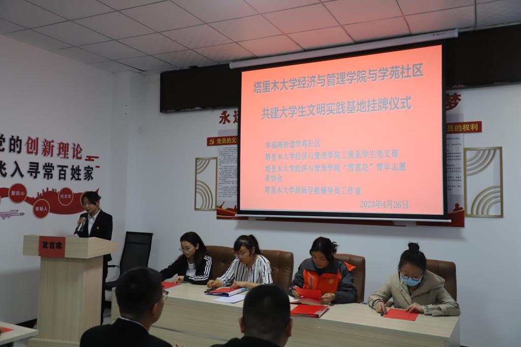 与学苑社区共建大学生文明实践基地签约挂牌仪式在阿拉尔市幸福路街道学院社区文明实践站举行。学院党委委员、学生办公室主任,学苑社区党委书记贾慧敏,及社区相关代表,经管院辅导员及学生代表参加仪式。