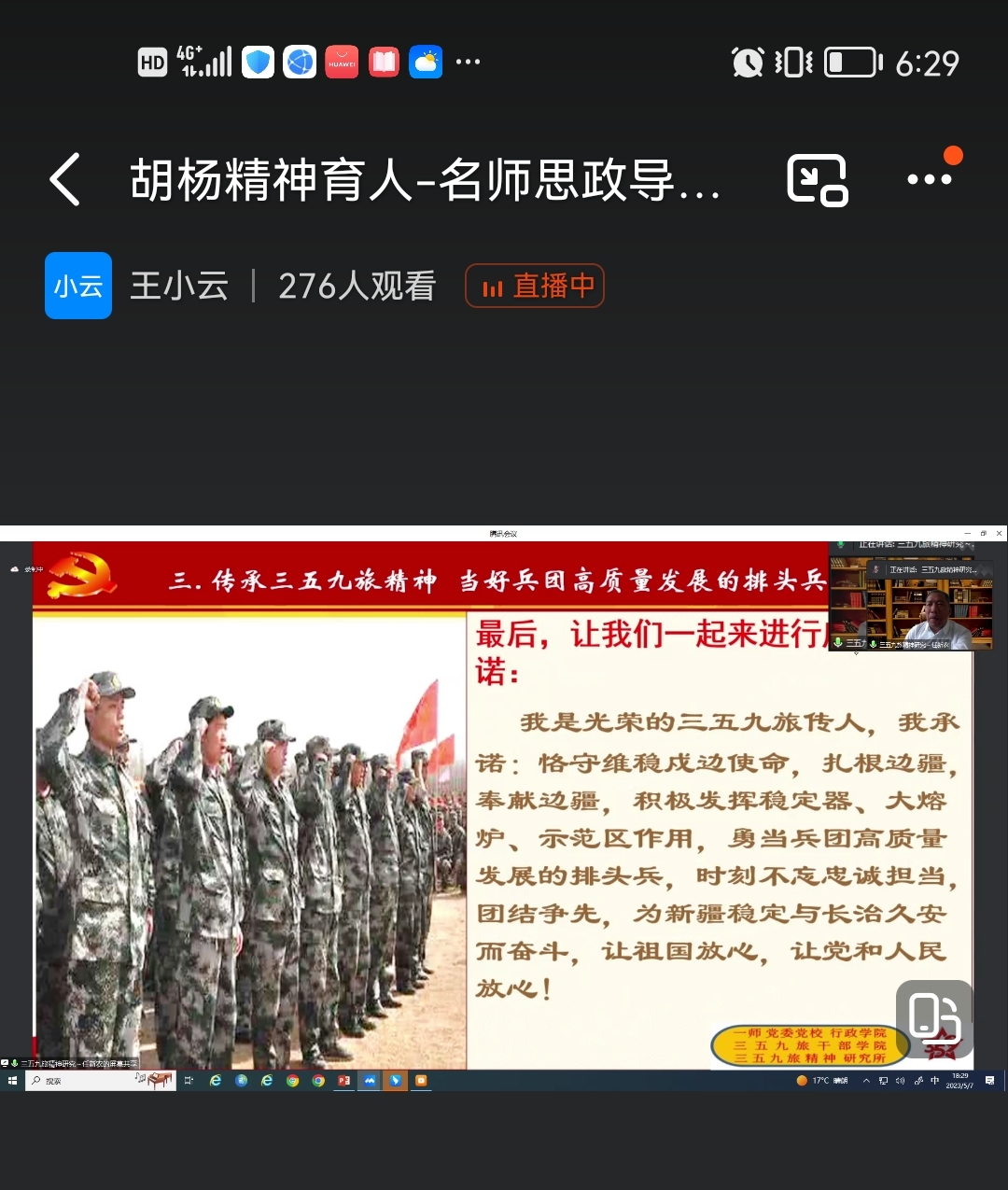 、胡杨导航辅导员工作室,邀请新疆生产建设兵团第一师三五九旅干部学院任新农副院长,共同开展“胡杨精神 兵团精神育人——名师思政导航课”跨校远程直播“大思政”课,讲座采用线上线下直播课堂,在综合楼智慧教室举行,51短视频