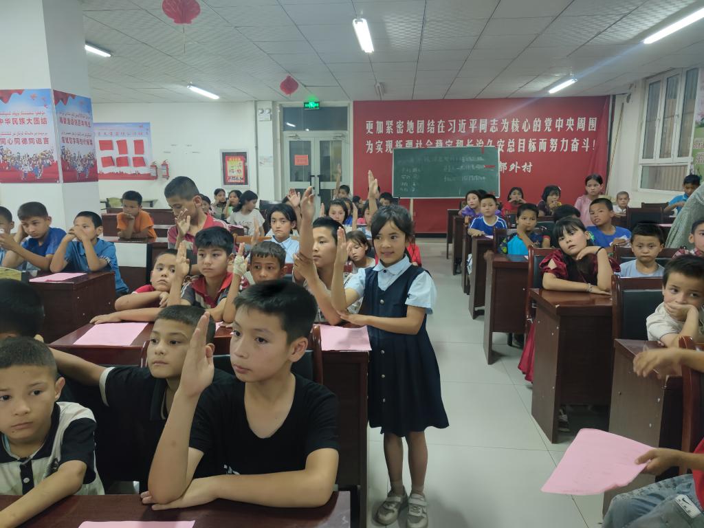 实践团在宣传资助政策之余帮助村委会开展文体活动。在村委会的活动室内,中小学生齐聚一堂,在实践团的组织下开展游戏活动:背古诗赢奖品。小朋友们都十分积极,争先恐后的举手背诵古诗。小朋友们天真而清澈的眼神,身上的朝气和渴望让实践团成员们十分动容。