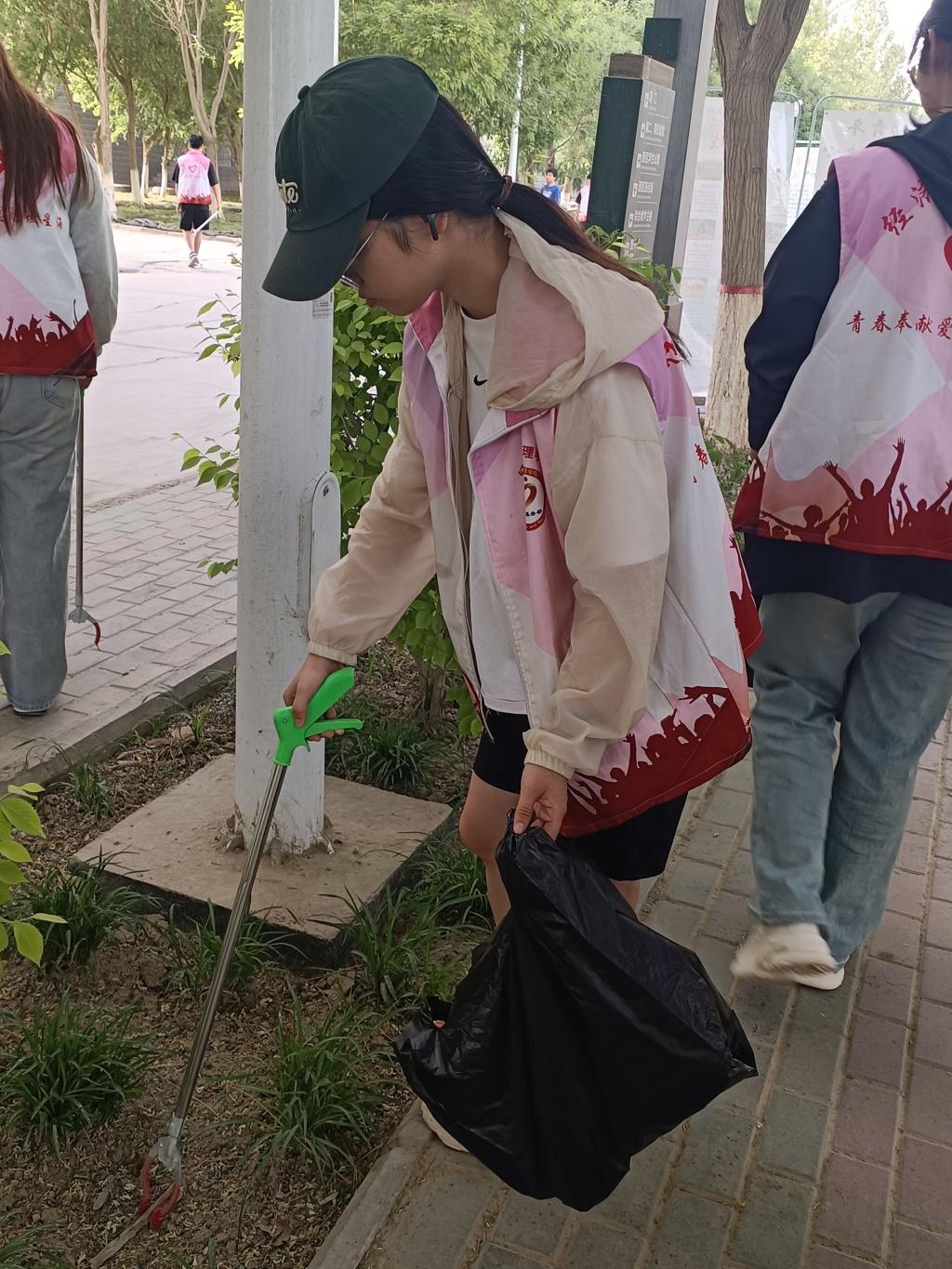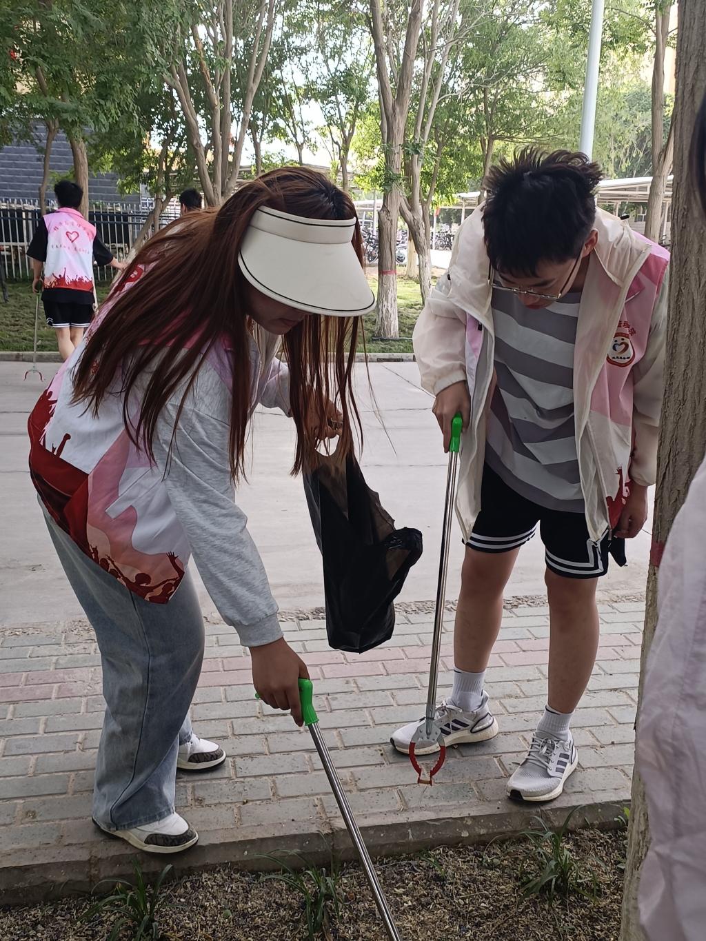 两个班级同学积极应很高,活动开始,班委分工明确,大家身穿志愿服,三两人一组,有的同学手持垃圾钳,有的同学拎着垃圾袋,还有的同学负责拍照记录。大家忙得不亦乐乎,满是汗水的脸庞洋溢着能够亲手美化校园的幸福与自豪。