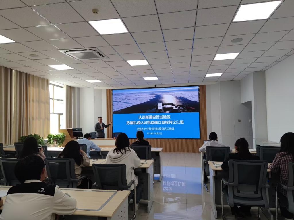 随后,王增强老师带来了新疆自由贸易试验区的专题讲座。他详细介绍了新疆自贸试验区的特点、战略定位及其对国贸专业人才的需求,鼓励同学们结合自身兴趣和发展目标,积极探索专业领域的实践机会。