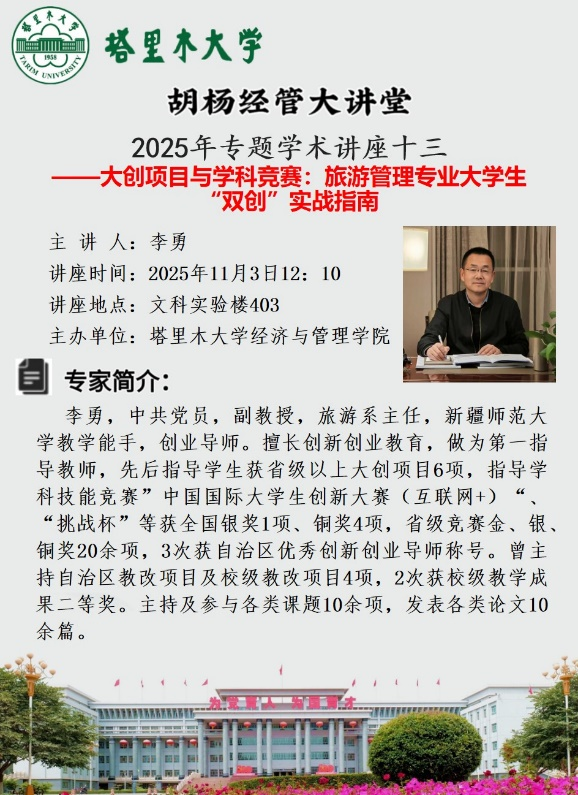 11月3日上午,本校旅游管理系特邀新疆师范大学旅游系主任李勇副教授,在新文科楼402/403教室作线上专题讲座——《大创项目与学科竞赛:旅游管理专业大学生“双创”实战指南》。本场讲座由本校旅游管理系主任李俊教授主持。