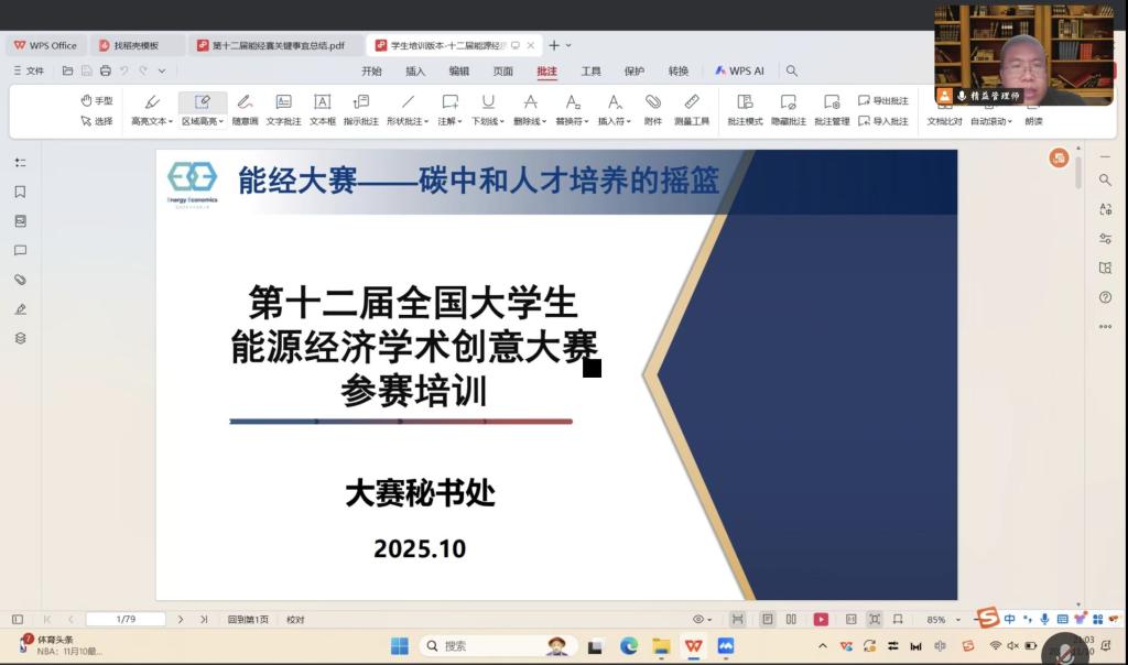 为激发学生科研热情,提升创新实践能力,助力“双碳”人才培养,2025年11月10日21:00点,由乡村振兴研究协会主办的第十二届全国大学生能源经济学术创意大赛培训会议在热烈的氛围中顺利举行。本次会议特邀马信春老师担任主讲嘉宾,吸引了来自各学院对能源经济与低碳发展领域感兴趣的同学积极参与。