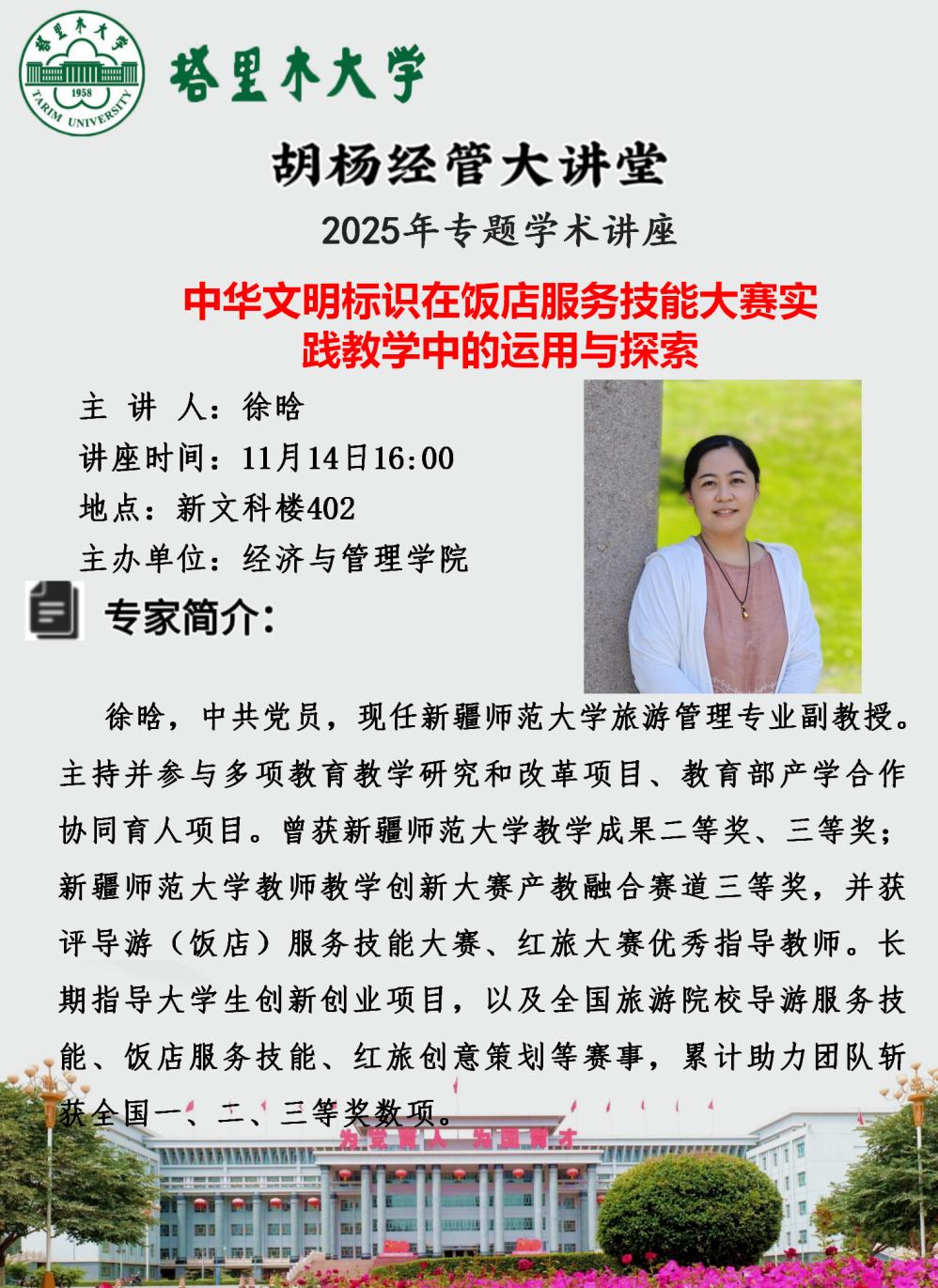 11月14日下午,旅游管理系邀请新疆师范大学徐晗老师作讲座,题目是《中华文明标识在饭店服务技能大赛实践教学中的运用与探索》,旅游管理系师生在文科实验楼402聆听讲座,系主任李俊主持活动。