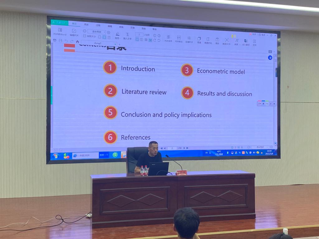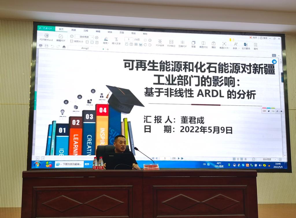 在文科实验楼504报告厅开展“经管大讲堂”第四讲——可再生能源和化石能源对新疆工业部门的影响:基于非线性ARDL的分析学术讲座。由学院科研与研究生管理办公室主任冯刚主持,硕士研究生导师董君成副教授主讲。
